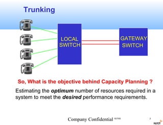 This document discusses capacity planning for GSM networks. It covers topics like trunking, traffic theory including traffic intensity, grade of service, busy hour, and request rate. It describes how to dimension traffic channels and SDCCH channels based on factors like traffic intensity and grade of service. It also discusses connectivity planning between network elements like MSC, BSC, transcoder, and BTS. It provides details on air interface, Abis interface between BSC and BTS, and different LAPD modes for signaling concentration over Abis. The objective is to estimate the optimal number of resources needed to meet performance requirements based on traffic analysis and engineering principles.