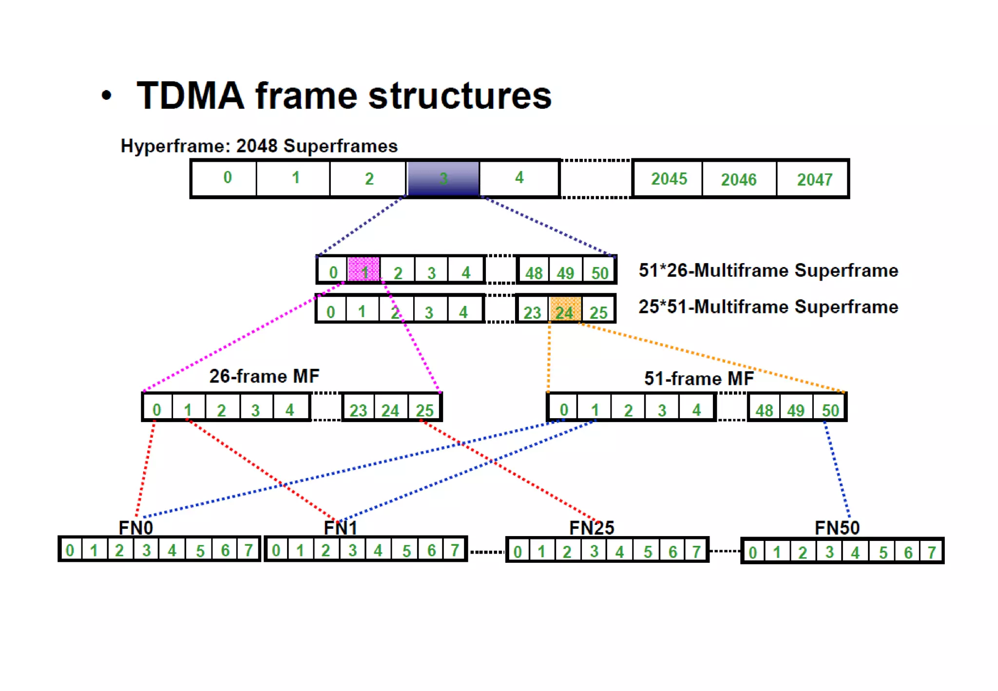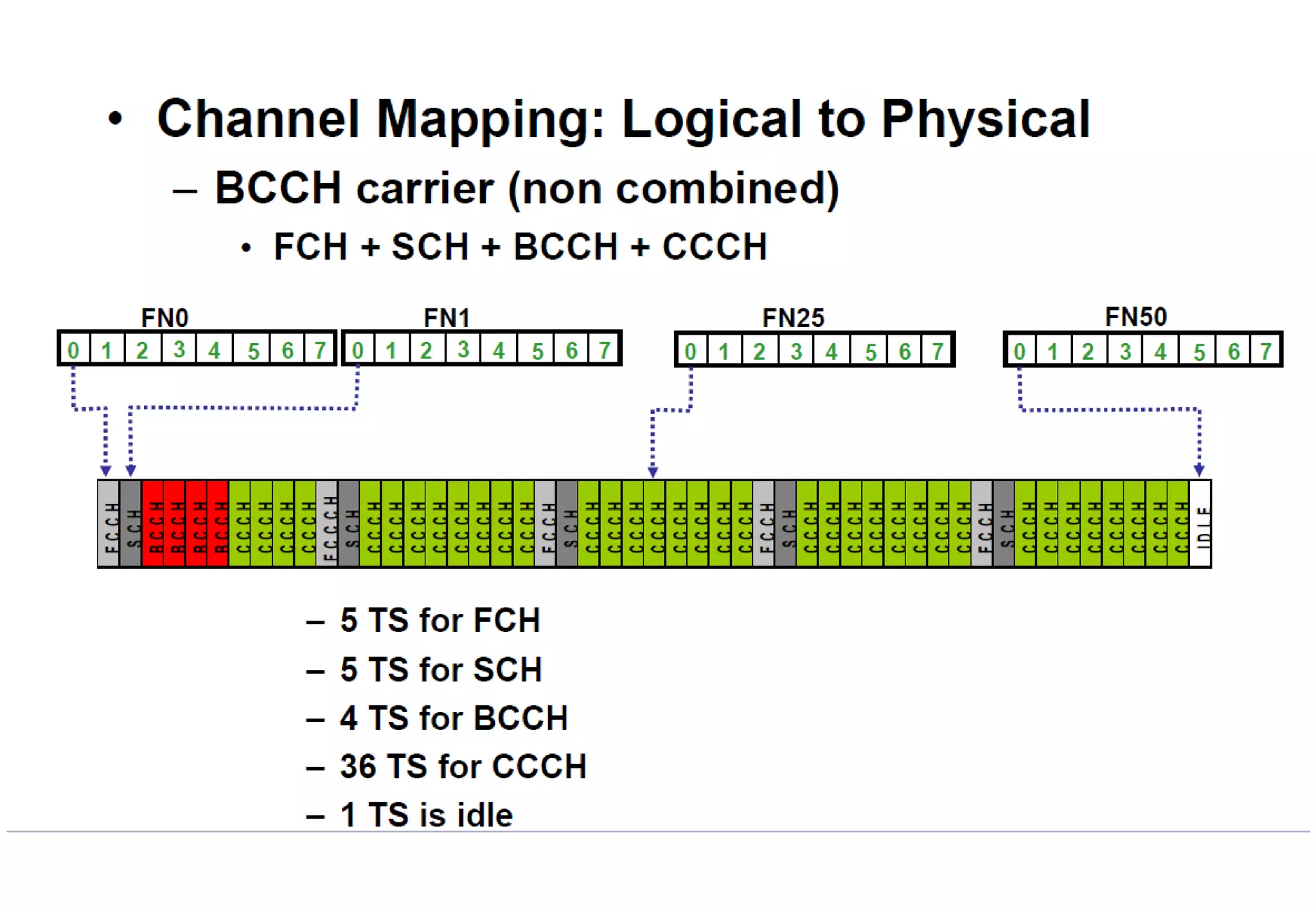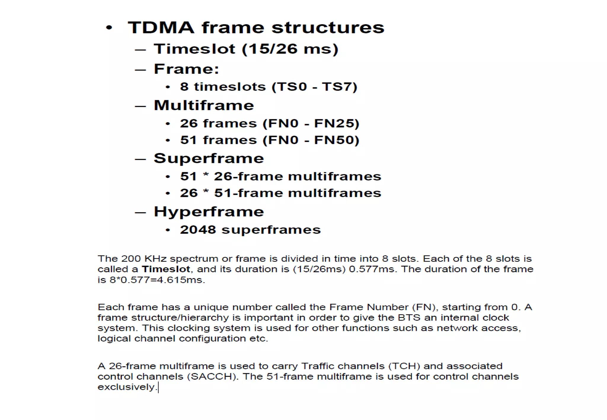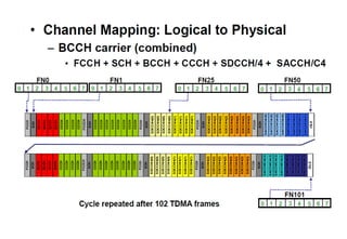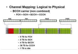 The document provides a comprehensive overview of GSM channel concepts and operations, detailing the frequency allocations for uplink and downlink channels as well as the structure of various logical channels used in GSM networks. It explains key concepts such as TDMA frame structure, control channels, SMS functionality, and subscriber identification through IMEI, MSISDN, and IMSI. The document also covers security mechanisms like SIM PIN management and TMSI for user confidentiality.