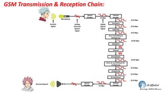 The document discusses the GSM transmission and reception chain, including processes such as speech encoding, error correction, and security measures. It explains the steps of digital signal processing, mobile channel coding, and the importance of modulation in ensuring effective communication. Additionally, it outlines GSM security protocols including authentication and ciphering techniques to protect user data.