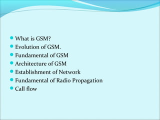 The document provides information on the Global System for Mobile communications (GSM). It discusses the evolution and standards of GSM, the architecture including components like the BSS, NSS and interfaces. It describes the radio interface technology used in GSM, call flow, and different types of handovers between network elements.