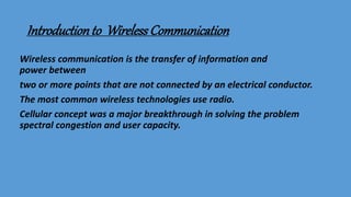 GSM (Global System for Mobile Communication) is a 2G digital cellular network. It was developed to address fragmentation issues in first-generation analog cellular systems and introduce digital technology and networking architectures. GSM specifies services, architecture, and frequencies. It uses a SIM card for user identification and supports voice calls and data services. GSM networks are organized into cells managed by switching centers. As users move between cells, the network performs handovers to maintain connections. GSM was followed by 2.5G, 3G, and 4G networks with increasing data speeds and capabilities.