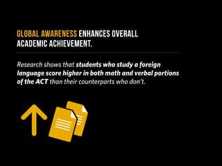 Studying abroad had a significant positive impact on subsequent education experiences for most students according to a survey, with 87% reporting an influence on later education and 86% saying it reinforced their commitment to foreign language study.