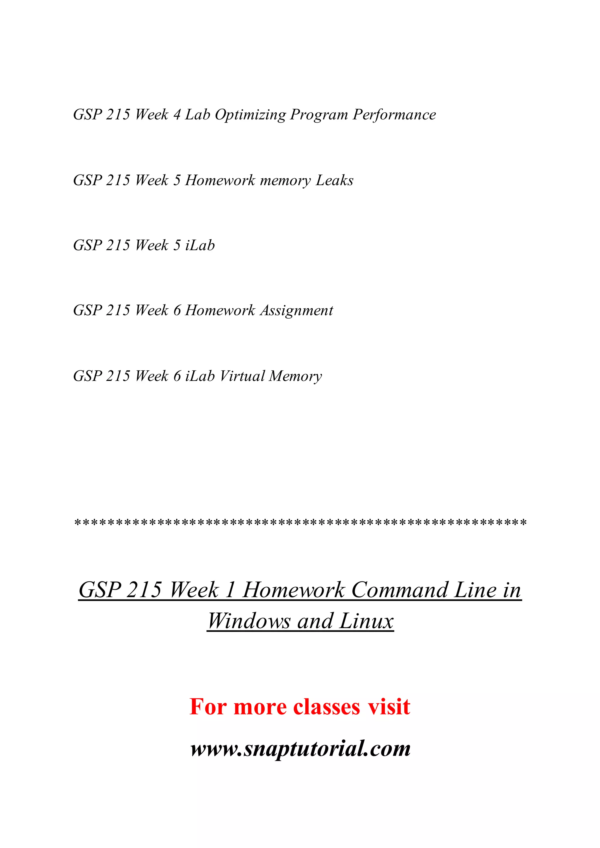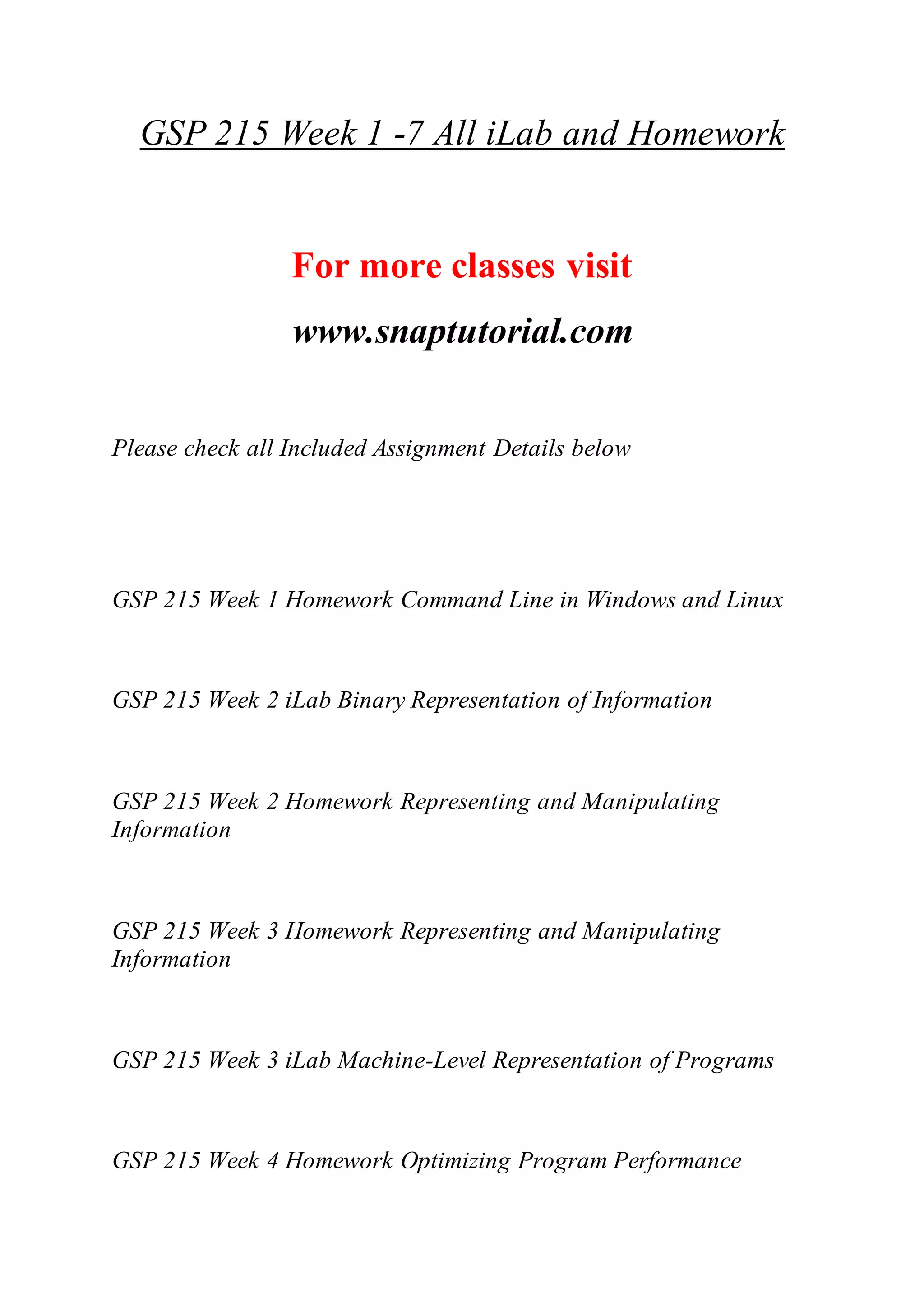 The document outlines the coursework for GSP 215, detailing assignments, labs, and learning objectives across seven weeks, covering topics such as command-line usage, binary representation, memory management, and program optimization. Each week includes specific homework and lab instructions designed to enhance understanding of computer systems and programming concepts. A variety of tasks are included, from theoretical research to practical coding exercises in C++.