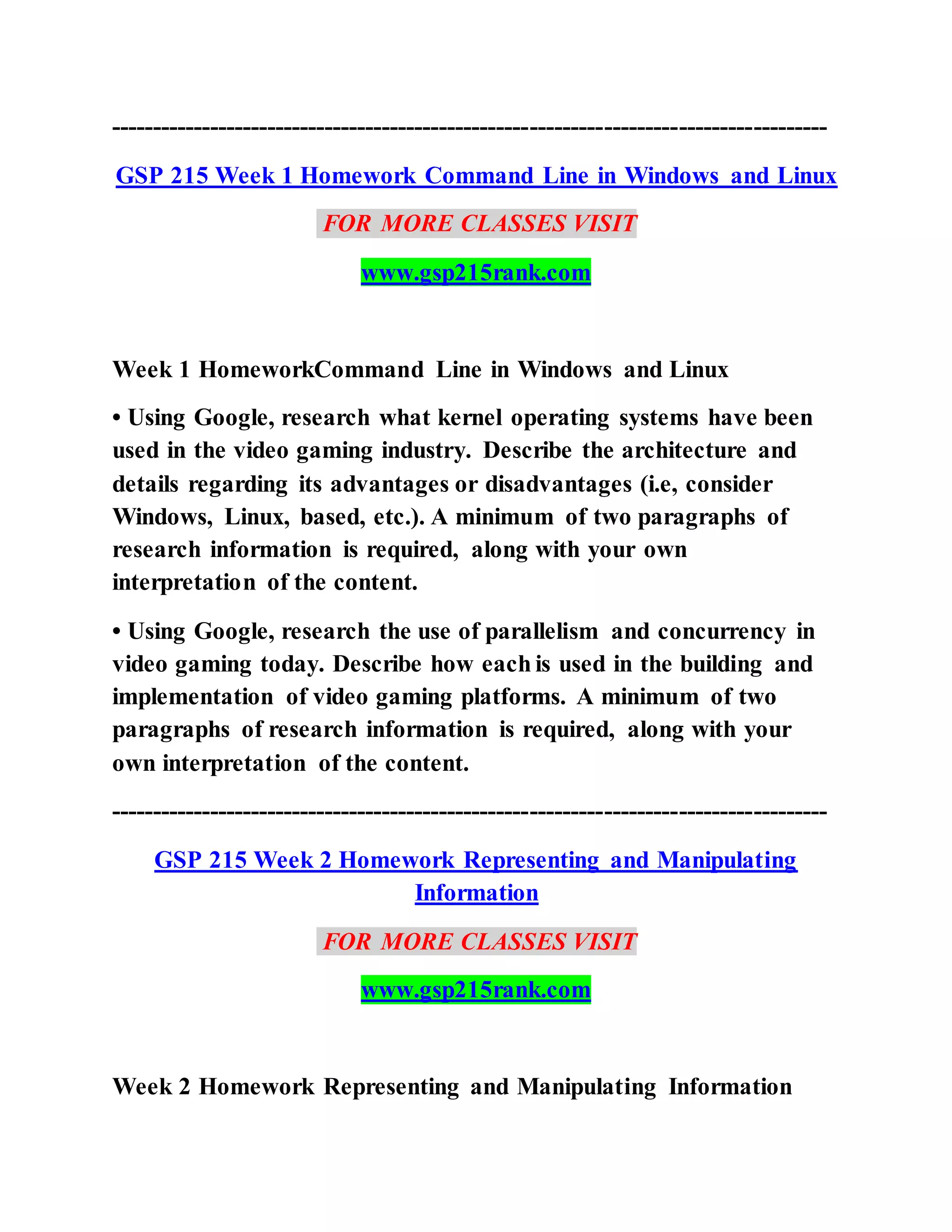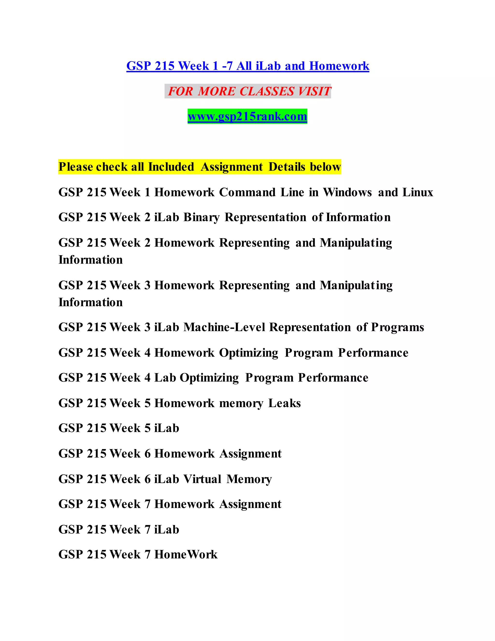 The document outlines the GSP 215 course assignments from weeks 1 to 7, including various homework and lab tasks focusing on programming concepts such as command-line usage, binary representation, data structures, and memory management in C++. Each week presents specific exercises requiring research, coding, and optimization techniques that contribute to understanding machine-level programming and performance optimization. The document serves as a comprehensive guide for students to enhance their skills in practical computer science applications.