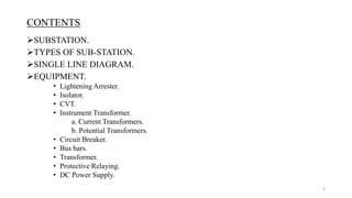 The document is a presentation on grid substations that discusses their purpose and key components. It begins by defining a substation as part of an electrical generation, transmission, and distribution system that transforms voltage from high to low levels. It then outlines the main equipment found in substations, including lightening arresters, isolators, transformers, circuit breakers, busbars, and protective relays. Instrument transformers like potential and current transformers are also explained. The presentation provides diagrams and descriptions of this essential infrastructure that forms the backbone of electrical networks.