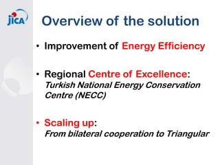 Turkey's National Energy Conservation Centre (NECC) has collaborated regionally to improve energy efficiency through training courses hosted in Turkey. Over the past decade, NECC has trained over 200 energy managers from over 20 neighboring countries in topics like energy auditing and management. This regional cooperation began with bilateral partnerships but expanded to involve multilateral actors. NECC's success is due to Turkey's history accumulating energy efficiency expertise since the 1970s, addressing common energy interests across countries, and ongoing capacity development efforts supported by partners like JICA.