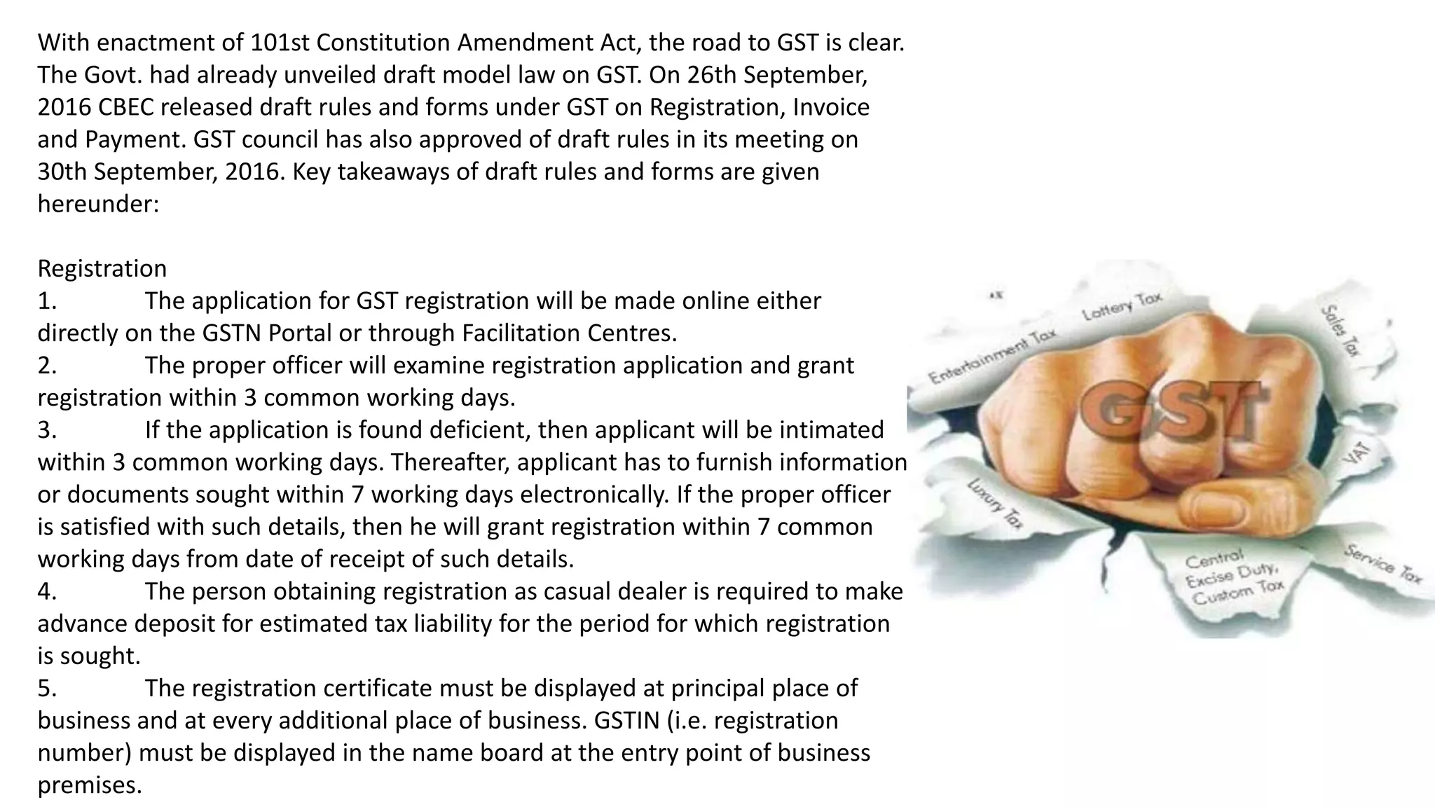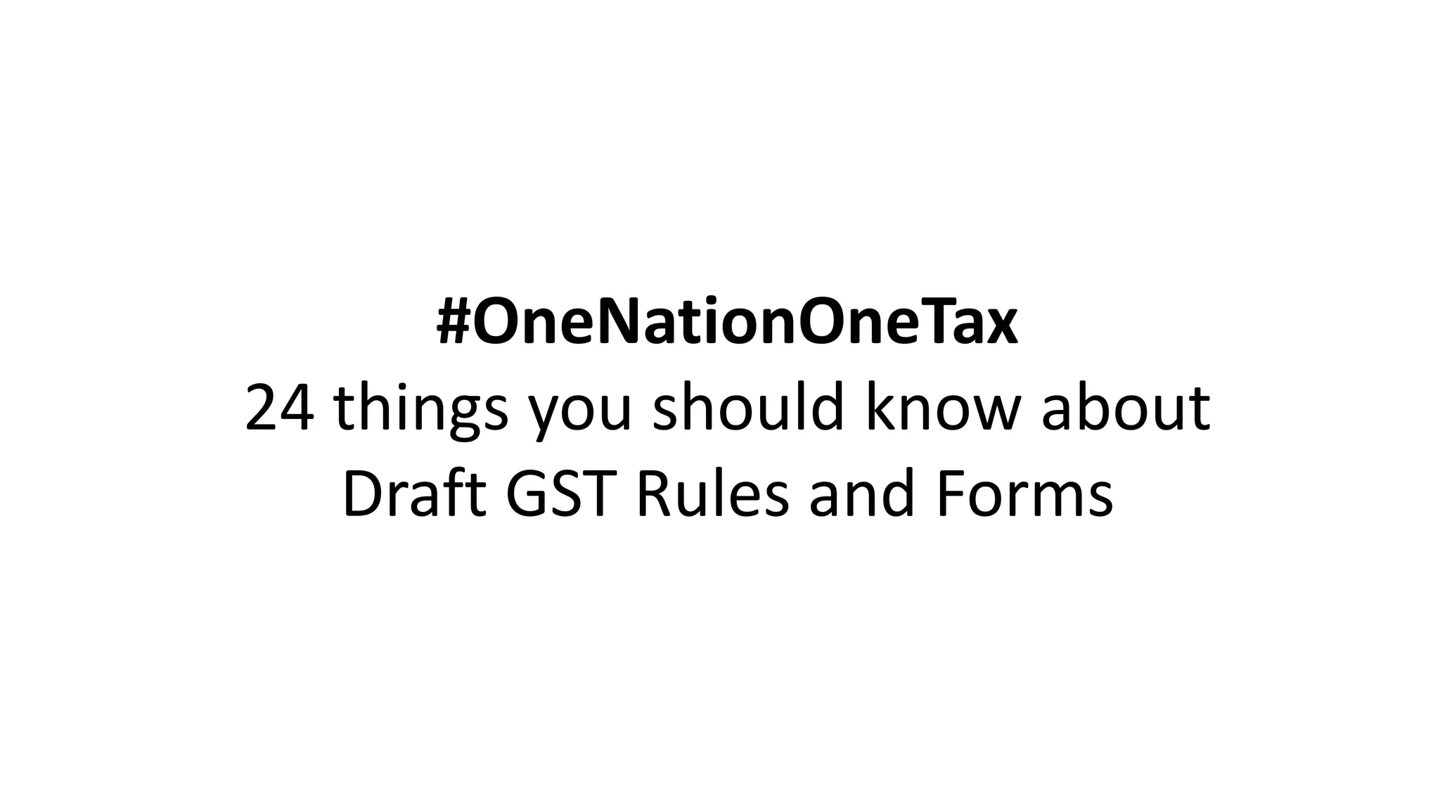 This document provides a summary of 24 key points about the draft GST rules and forms released by the Central Board of Excise and Customs (CBEC) related to registration, invoices, returns, payments, and refunds under the Goods and Services Tax (GST) regime in India. Some highlights include that registration applications will be made online, registration will generally be granted within 3-7 days, invoices must include certain details for supplies over Rs. 50,000, registered taxpayers will file monthly GSTR-1, GSTR-2 and GSTR-3 returns, electronic ledgers will track tax liability, credits, and payments, and refund claims can receive provisional 80% refunds under certain conditions.