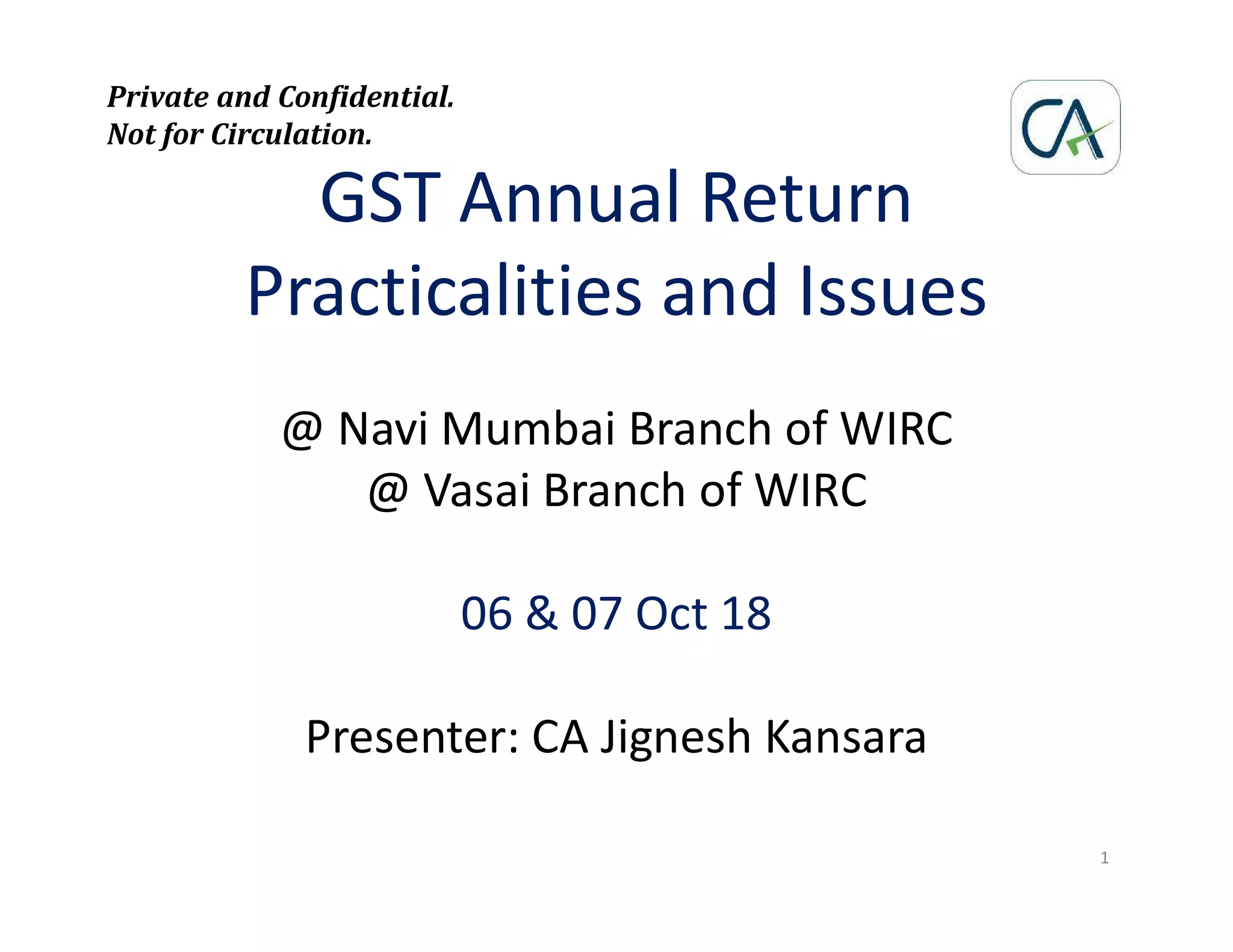 The document provides information about filing GST annual returns, including practical issues and concerns. It discusses key details like the statutory requirement to file annual returns, consequences of non-compliance, important dates and deadlines. It emphasizes the importance of annual returns for claiming input tax credit, adjusting credit and debit notes, retention of accounts, and timelines for assessments. The annual return aims to consolidate transaction details declared over the previous 15 months in GSTR-1, GSTR-3B and other returns.