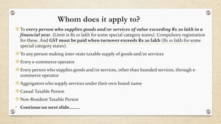GST is a new indirect tax that will replace multiple taxes into a single tax. It will be levied as CGST, SGST, and IGST depending on whether a good or service is intra-state or inter-state. Many existing taxes such as VAT, excise, customs, etc. will be subsumed into GST. Taxpayers will be able to claim input tax credit which allows for tax cascading benefits. Certain items like petroleum products and alcohol are exempted from GST. The GST rates are proposed to be 5%, 12%, 18%, and 28% with some items falling into each slab.