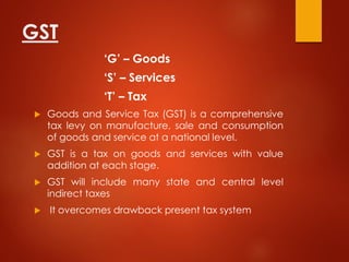 - GST is a comprehensive indirect tax that will combine multiple state and central taxes into one. It is levied at each stage of production and distribution.