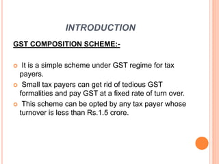 This document provides an introduction and overview of India's GST composition scheme. Key points include: