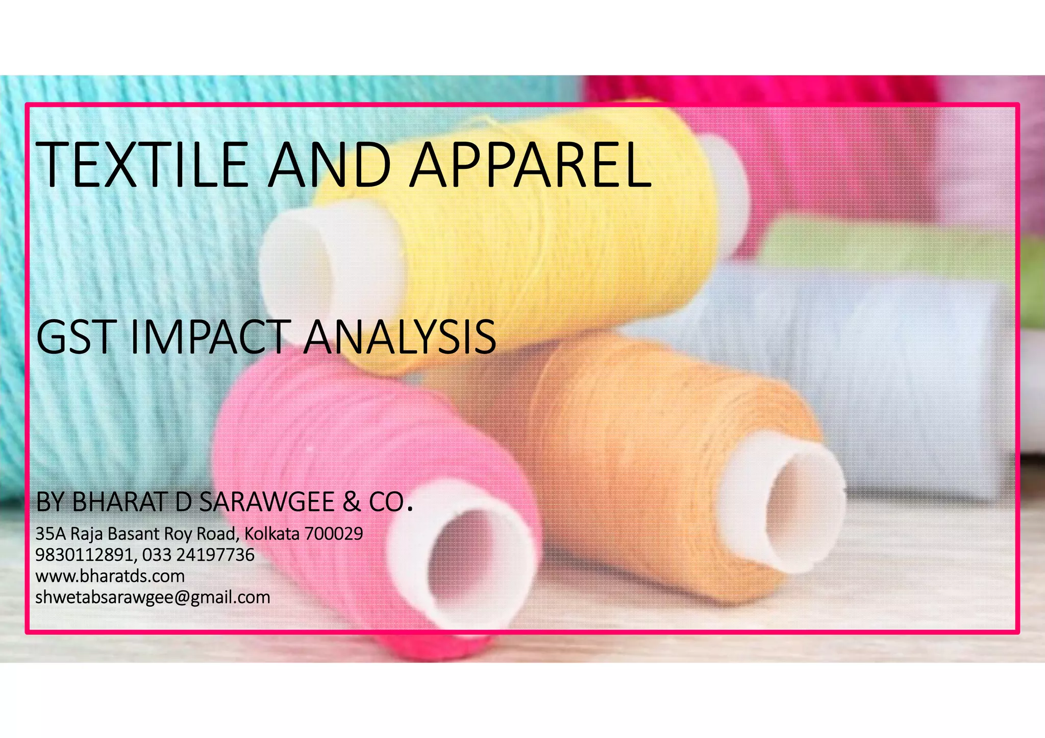 This document analyzes the impact of implementing GST on the textile and apparel industry in India. It provides an overview of the industry, describes the current tax structure, and analyzes how GST would impact different segments of the industry value chain, including natural fibers, man-made fibers, exports, and imports. It notes both potential benefits like input tax credits, a level playing field, and simplification, as well as challenges of the proposed GST rates being higher than current effective rates and difficulty bringing small units into the tax net.
