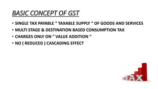 - GST is a single, destination-based tax levied on the supply of goods and services. It subsumes several taxes into a single tax.
