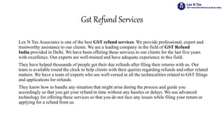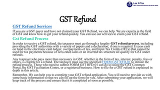 The document outlines the GST refund process and services provided by Lex N Tax Associates, including eligibility, required forms, and necessary documentation for claims. Taxpayers can claim refunds under specific circumstances, such as overpayments or for exports, and must follow the procedures laid out in the GST Act. Lex N Tax Associates offers expert assistance to simplify the refund application process and ensure timely resolution for clients.