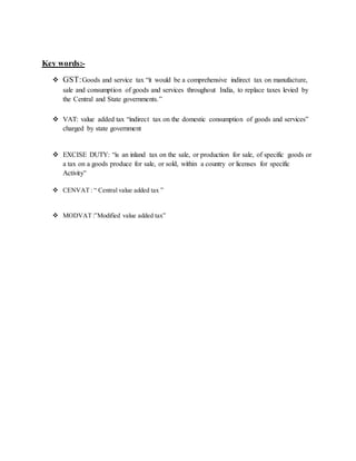 The document summarizes key aspects of the Goods and Services Tax (GST) proposed to be implemented in India. It discusses how GST aims to address the cascading effect of taxes under the current system by introducing a single indirect tax on the supply of goods and services. It highlights some benefits of GST like reducing economic distortions, boosting tax revenues, and making exports more competitive. However, it also notes challenges in GST implementation like the deferred application to some petroleum products potentially leading to continued tax cascading, and the need for cooperation between central and state governments.
