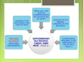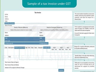 This document compares tax invoice rules and requirements under the current tax regime to those under the new GST regime. Key changes under GST include requiring place of supply and HSN/accounting codes on invoices. The GST regime introduces provisions for bill of supply, receipt vouchers, refund vouchers, and delivery challans. Special cases like input service distributors and transport agencies have their own invoice requirements. Overall, the GST invoice rules aim to standardize and simplify compliance for taxpayers.