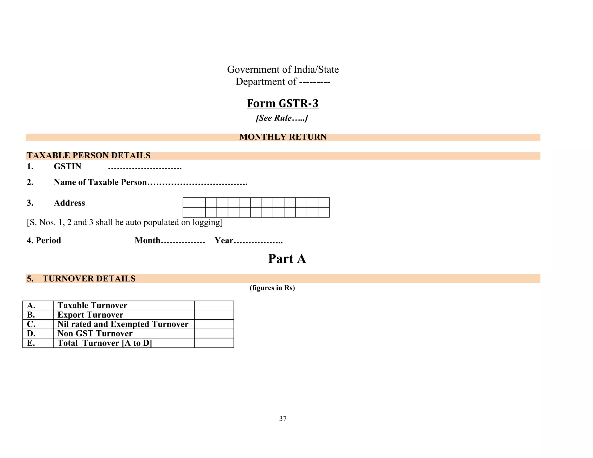 The document is a detailed form for filing monthly GST returns (GSTR-3) in India, outlining various sections for reporting turnover, outward and inward supplies, and tax liabilities. It includes provisions for inter-state and intra-state supplies, revisions, and tax credit claims, with specific auto-populated fields linked to previous GSTR submissions. The form emphasizes the declaration of accuracy and provides a contact for assistance with GST compliance.