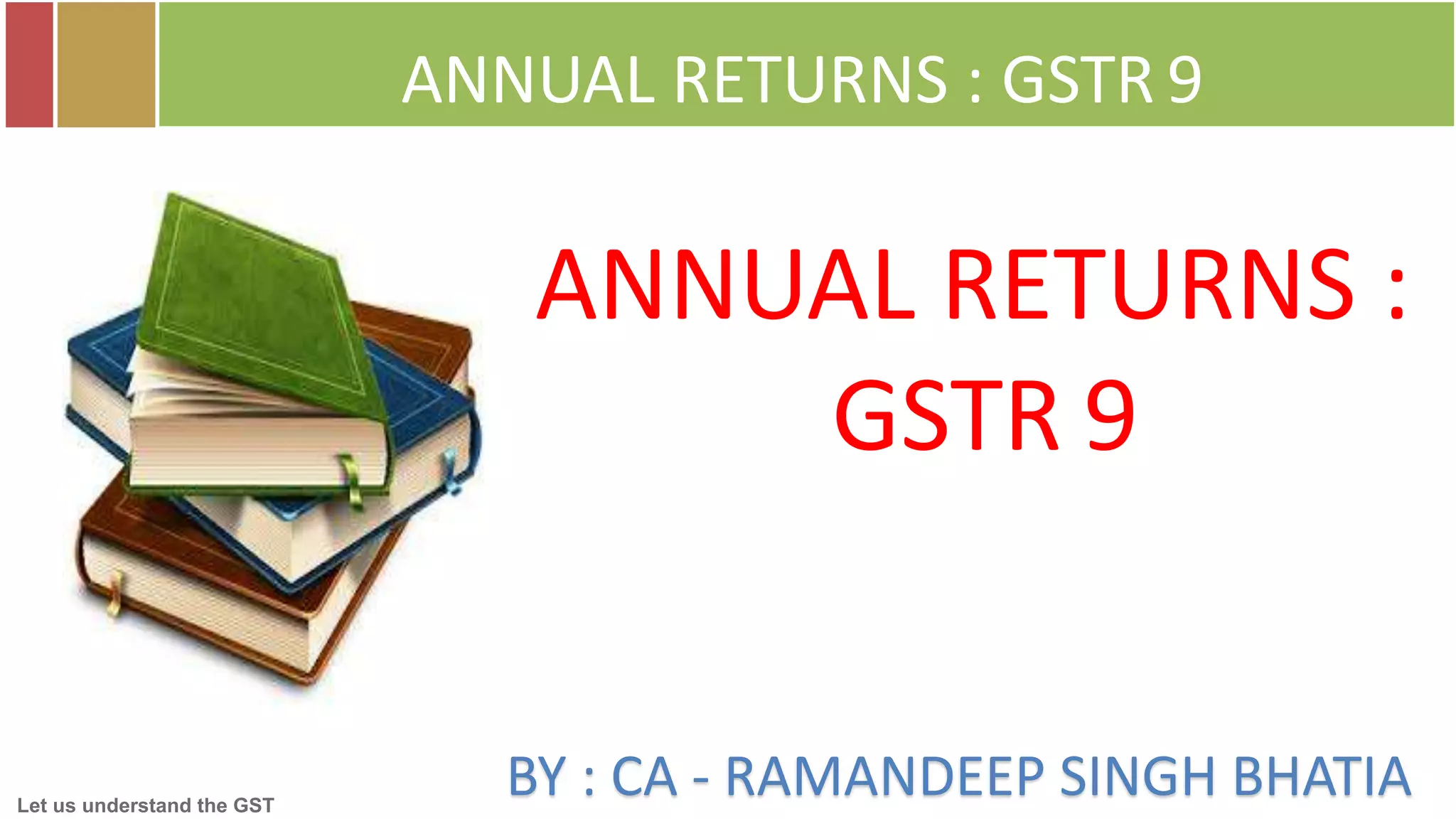 The document provides a comprehensive overview of the Goods and Services Tax (GST) annual return filing process in India, focusing on GSTR 9 and its various components, regulatory requirements, deadlines, and penalties for late filing. It details the types of registered persons required to file and outlines essential parts of the return, including outward and inward supplies, input tax credits, and reconciliation aspects. Additionally, it highlights key dates and emphasizes the necessity for accuracy in reporting to avoid potential penalties or discrepancies.