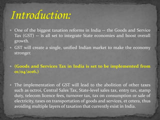 The Goods and Services Tax (GST) is a major tax reform in India aimed at creating a unified market by integrating various state economies and eliminating multiple layers of taxation. Scheduled for implementation from April 2016, GST replaces numerous existing taxes with a single comprehensive tax on goods and services, benefiting both consumers and businesses by reducing complexities and hidden costs. While it is expected to enhance revenue for many states, concerns remain among some regions regarding potential revenue losses and the readiness for a nationwide roll-out.