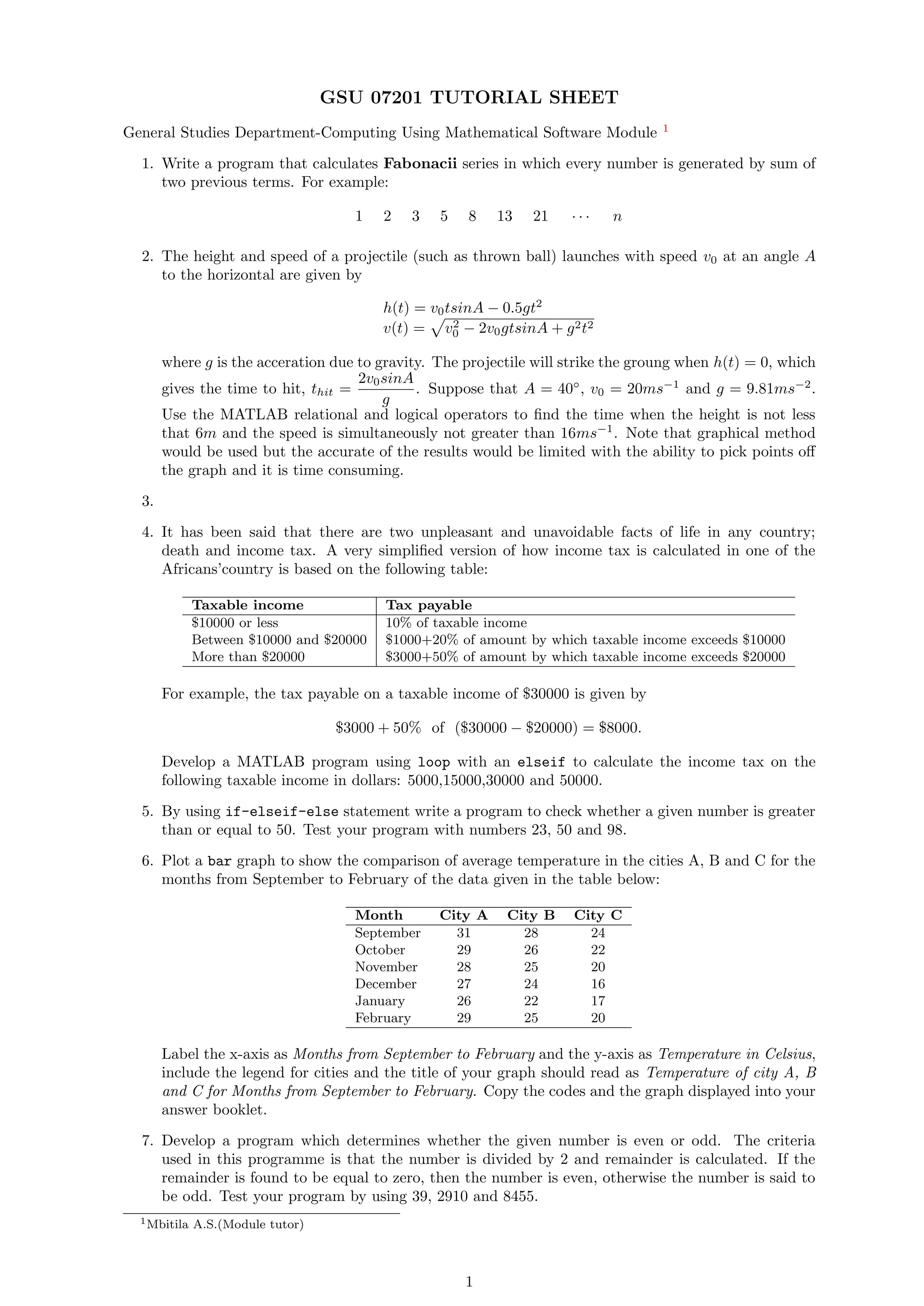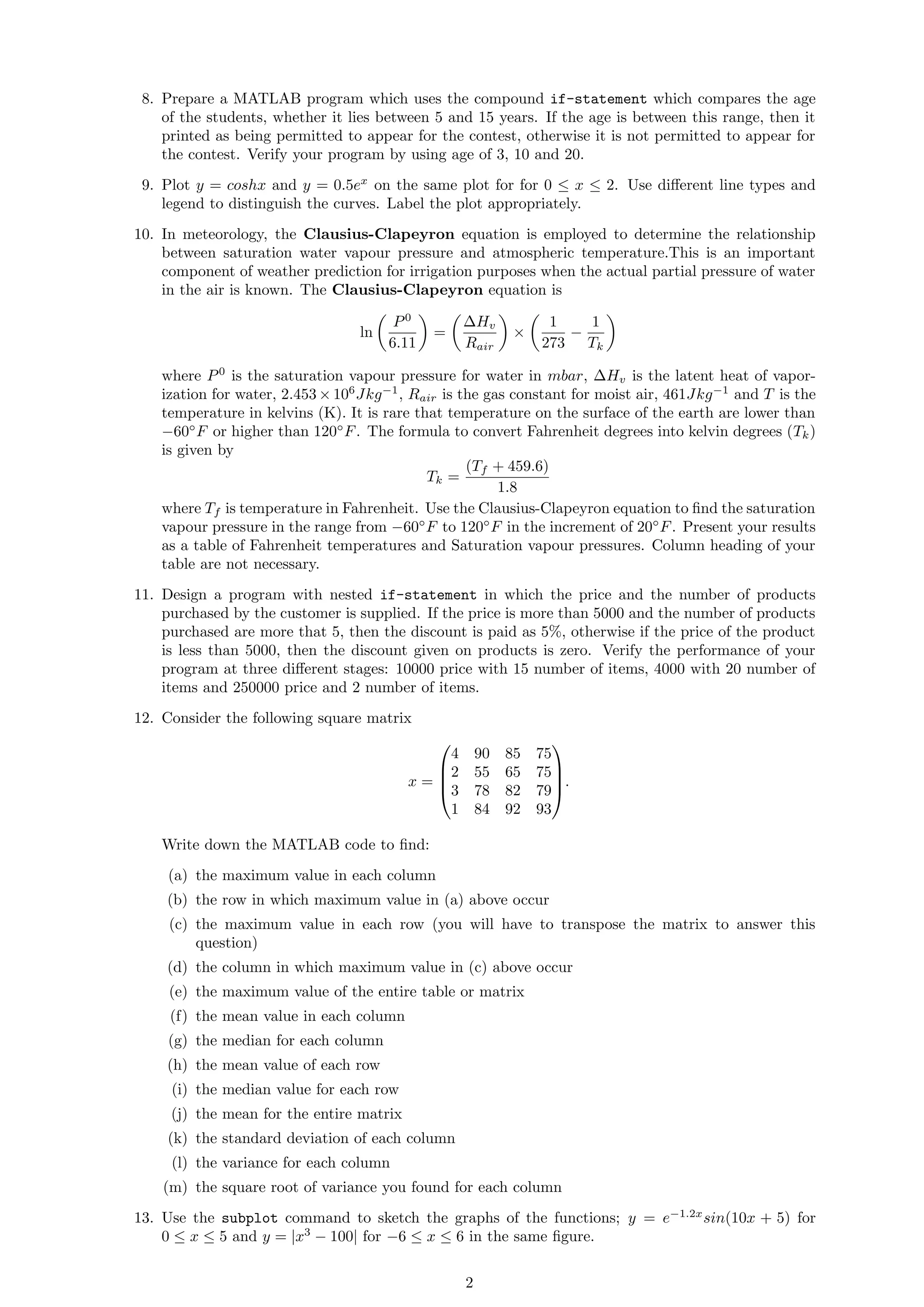 This document provides 16 MATLAB programming exercises involving calculations with matrices, plotting functions, conditional statements, and other concepts. Exercise 2 asks the student to use MATLAB relational and logical operators to find the time when a projectile's height is above 6m and speed is below 16m/s. Exercise 4 develops a program to calculate income tax amounts based on taxable income levels and tax rates. Exercise 10 uses the Clausius-Clapeyron equation to calculate saturation vapor pressure over a range of temperatures.