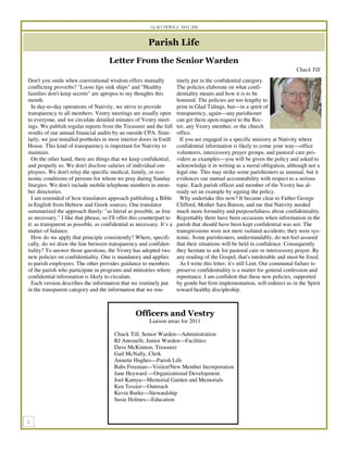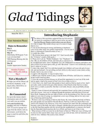 The document introduces the new rector, Stephanie, with her top 10 obscure facts. It also discusses upcoming events at the Church of the Nativity including Youth Sunday and VBS planning meetings. Additionally, it addresses the parish implementing new confidentiality policies to protect sensitive information and ensure parishioners feel comfortable seeking pastoral care.