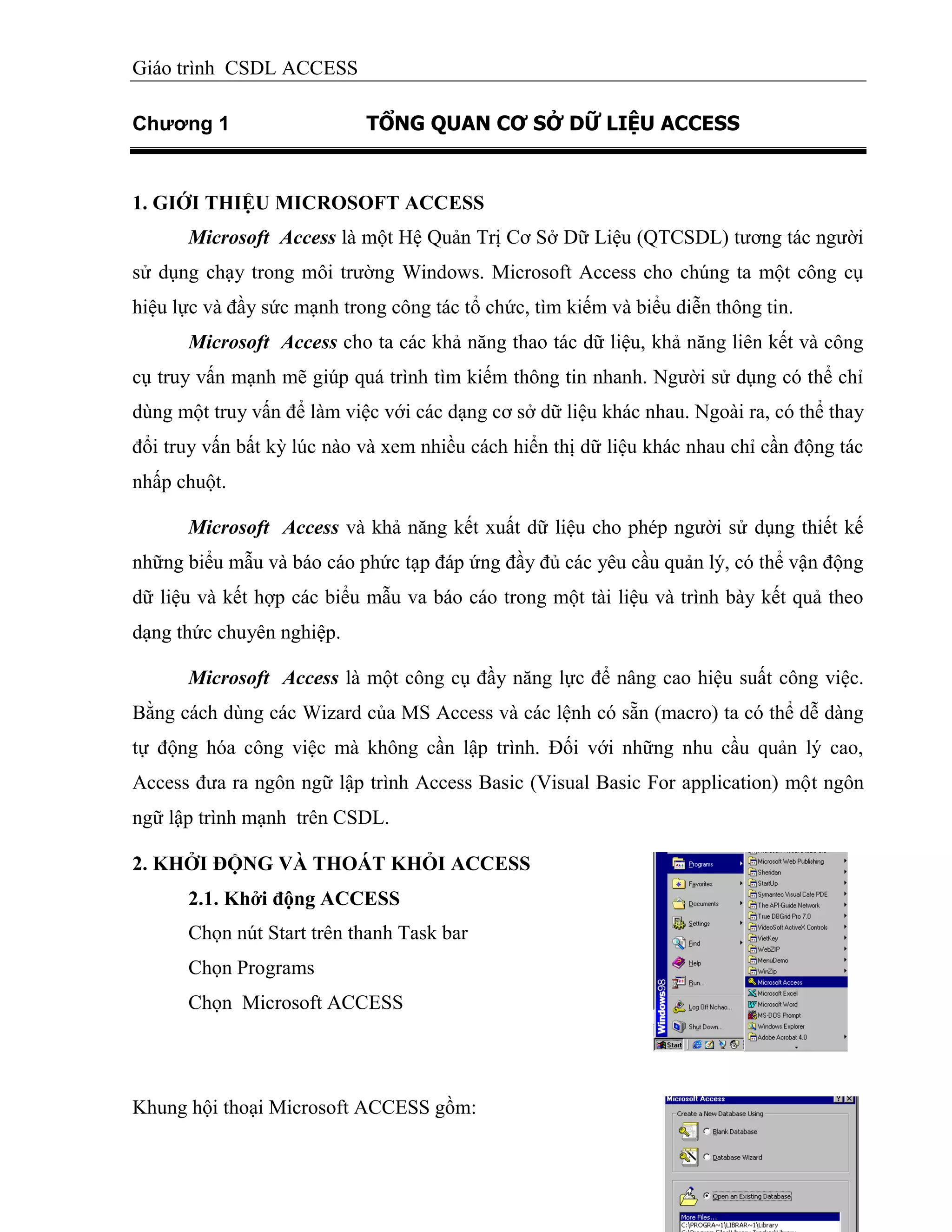 Giáo trình CSDL Access giới thiệu Microsoft Access như một công cụ quản lý cơ sở dữ liệu mạnh mẽ trên nền tảng Windows, giúp tổ chức và truy vấn thông tin hiệu quả. Tài liệu cung cấp hướng dẫn chi tiết về khởi động, thao tác với tập tin, các thành phần cơ bản của cơ sở dữ liệu, cũng như cách thiết kế và tạo bảng dữ liệu để quản lý thông tin. Ngoài ra, giáo trình cũng đề cập đến các thuộc tính liên quan đến kiểu dữ liệu và cách định dạng dữ liệu trong Access.