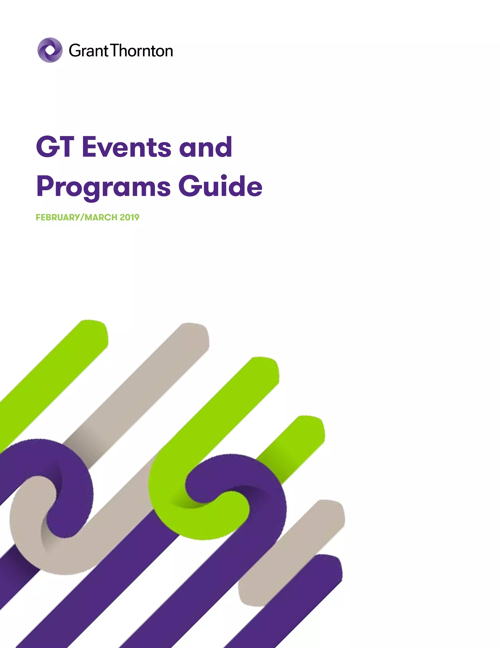 The GT Events and Programs Guide outlines the challenges businesses face in a complex global landscape marked by regulatory risks and technological changes, highlighting insights and resources from Grant Thornton LLP to assist clients. It emphasizes the need for sustained growth and effective risk management in various business strategies, including M&A processes, digital transformation, and compliance. The guide also promotes upcoming events, research findings, and thought leadership aimed at helping organizations navigate current market trends and improve operational efficiencies.