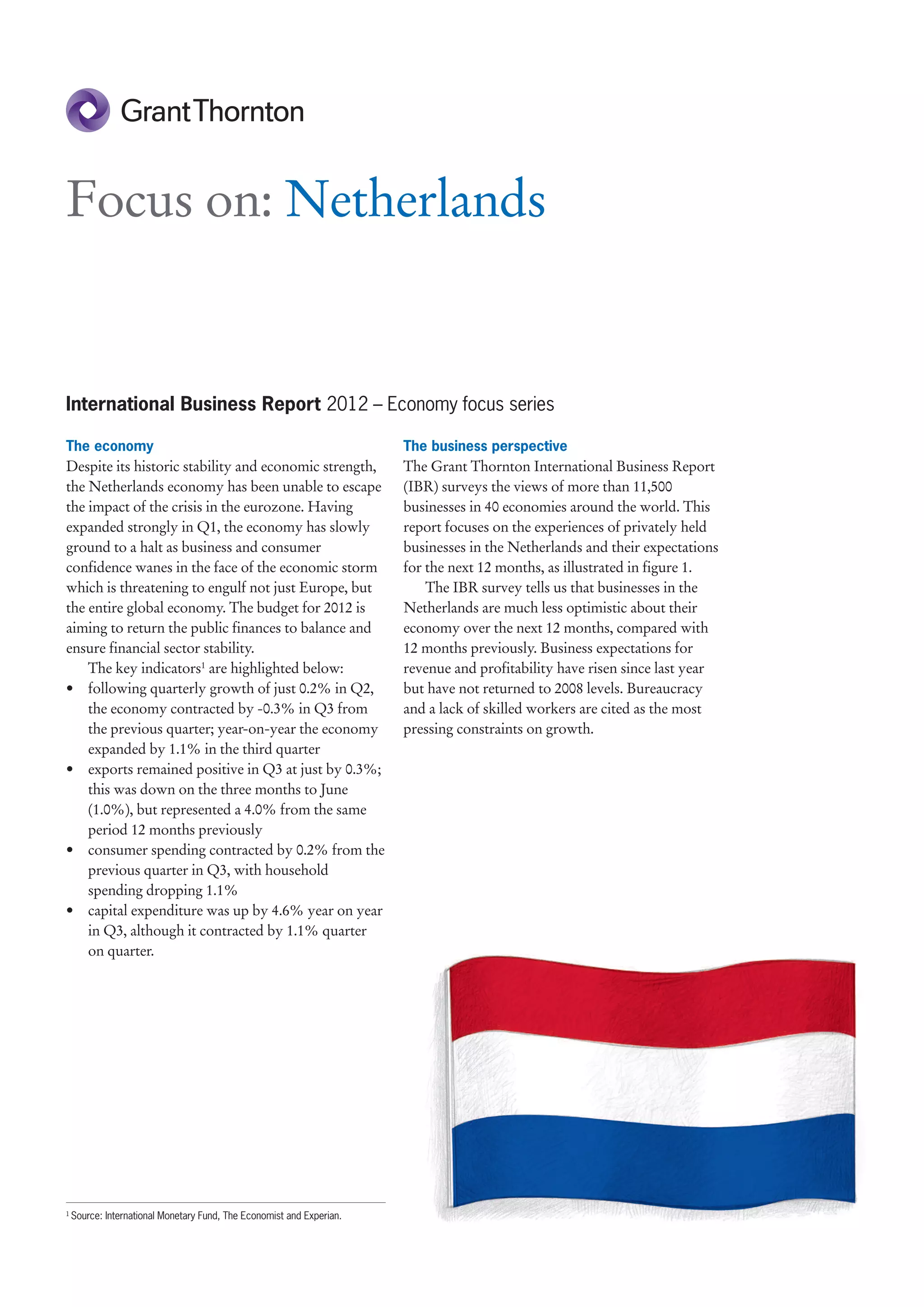 The Dutch economy has slowed due to the eurozone crisis, with GDP contracting in Q3 2011. Exports remain positive but are expected to decline as demand from Europe and the US weakens. Businesses in the Netherlands are pessimistic about the economy over the next year, though revenue and profit expectations have risen slightly since 2010. A lack of skilled workers and regulations are cited as top constraints on business growth. The outlook is linked to the eurozone - a complete meltdown would seriously threaten forecasts of a return to moderate growth by 2013.