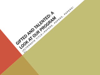 This document outlines the 7 step process for identifying and placing students in gifted and talented programs at the elementary level. It includes collecting information from schools and test scores, informational meetings for incoming 5th graders and their parents, a committee review to determine placement, additional testing if needed, announcing placements to parents, handling move-ins or requests, probation procedures, and quarterly teacher meetings. It also discusses common social-emotional issues for gifted students and quotes about giftedness.