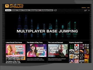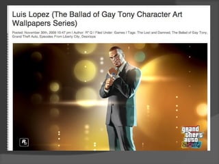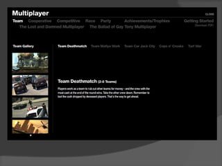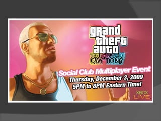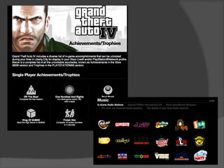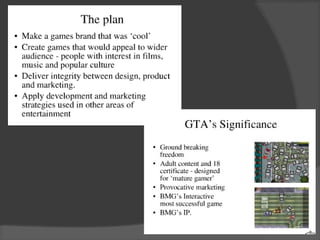 This document provides information about Grand Theft Auto IV (GTA IV) to assist with a case study. It outlines that GTA IV is an open world action-adventure game developed by Rockstar North and published by Rockstar Games. It was released in 2008 for PlayStation 3 and Xbox 360. The document discusses GTA IV's production, including its development using Rockstar Advanced Game Engine (RAGE) and Euphoria animation system. It also covers the game's marketing and distribution across multiple platforms, and its commercial success in selling over 25 million copies.