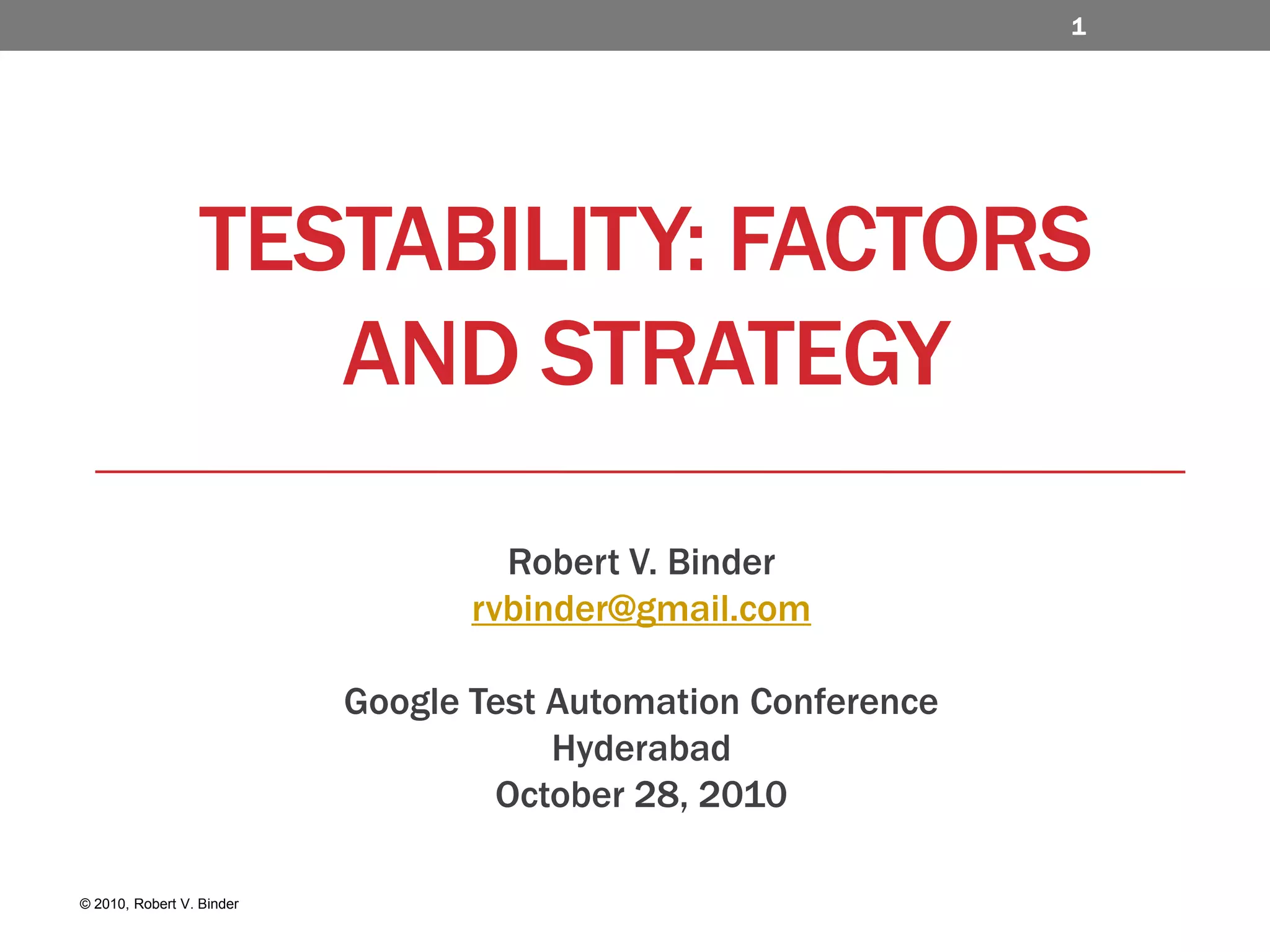 The document discusses the importance of testability in software systems, outlining factors that affect both white box and black box testability. It emphasizes the need for controllability and observability in test design, as well as strategies to improve testability through structured code and automation. Additionally, it addresses challenges such as system complexity, resource constraints, and the significance of understanding system requirements for effective testing.