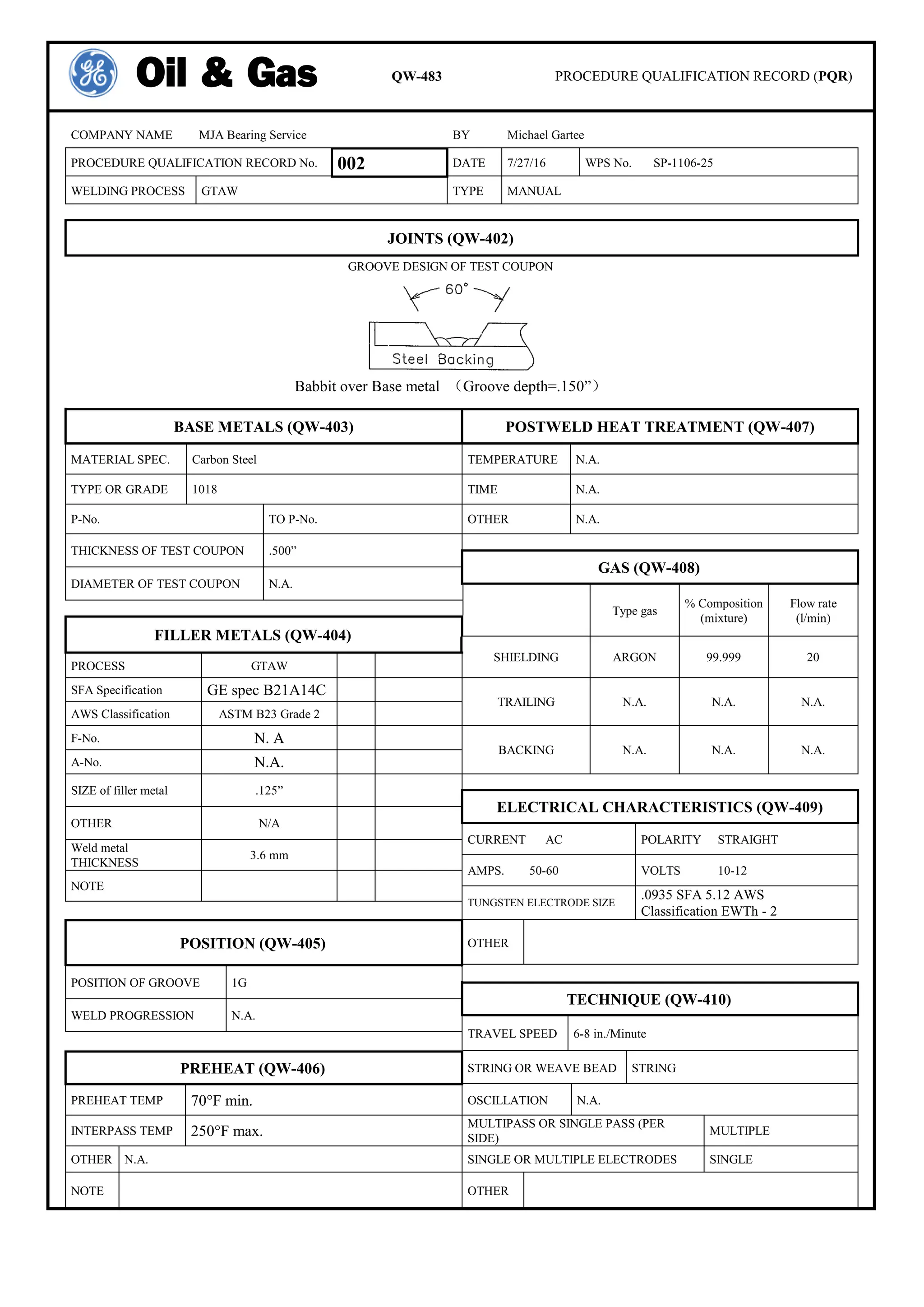 This document is a Welder Performance Qualification Record that qualifies welder Michael Gartee to perform repair welding according to procedure QR-M-Bearing-001. It details the welding process, material, and examinations and tests performed, including visual inspection, penetrant testing, macro testing, and bend testing, all of which were found to be acceptable. The welder is considered qualified to perform repair welding according to the requirements and limitations of the procedure.