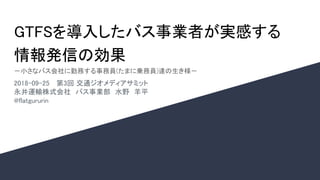 GTFSを導入したバス事業者が実感する 情報発信の効果 -小さなバス会社に勤務する事務員(たまに乗務員)達の生き様- 2018-09-25 第3回 交通ジオメディアサミット 永井運輸株式会社 バス事業部 水野 羊平 @flatgururin