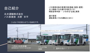 自己紹介 永井運輸株式会社 バス事業部 水野 羊平 こんなバスを走らせている会社です。 バス事業全般の事業計画(路線・施設・運賃) 主に路線バスの運行計画(ダイヤ) 補助金等申請… いわゆる「企画」業務 運行管理 運転業務(バスの運転もたまに) ↑ボロい(22年在籍) 減車届提出済。今月中にいなくなります ↑ 基本小さい… ↑ ↑ワンドアRN (貴重) もともと車輌台数が少ないので、日中は予備車がほとんどいません…