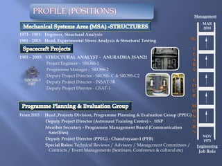 M.V. Kannan has had a 36 year career at ISRO, working on over 50 satellite projects since joining in 1973. He has held several leadership roles including structural analyst, project engineer, program manager, and deputy project director for satellites like SROSS, INSAT-3B, GSAT-1, and Chandrayaan-1. Throughout his career, he has focused on structural analysis, experimental stress analysis, structural testing of spacecraft, and project management. He overcame technical challenges through continuous learning, knowledge management, analytical tool development, and infrastructure upgrades. As a manager, he developed skills in people management, emotional intelligence, and maintaining a broad understanding while leading multi-project environments.