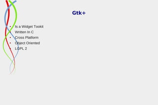 Gtk+ is a widget toolkit for building graphical user interfaces. It uses several libraries like GLib for core functions, GObject for object-oriented programming, and Gio for file and network operations. Gtk+ started in the 1990s and is currently at version 3. It is used in many GNOME applications and supports multiple programming languages through bindings like Vala.