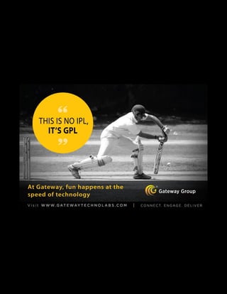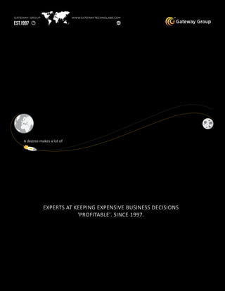 Gateway Group is a global IT services company established in 1997 that has experienced strong growth. It has zero debt and liabilities since inception, operates across 30 countries, and is considered one of the most resilient and risk-managed organizations of its size. It provides a wide range of technology services and solutions across several industries like automotive, healthcare, banking, entertainment, and government.