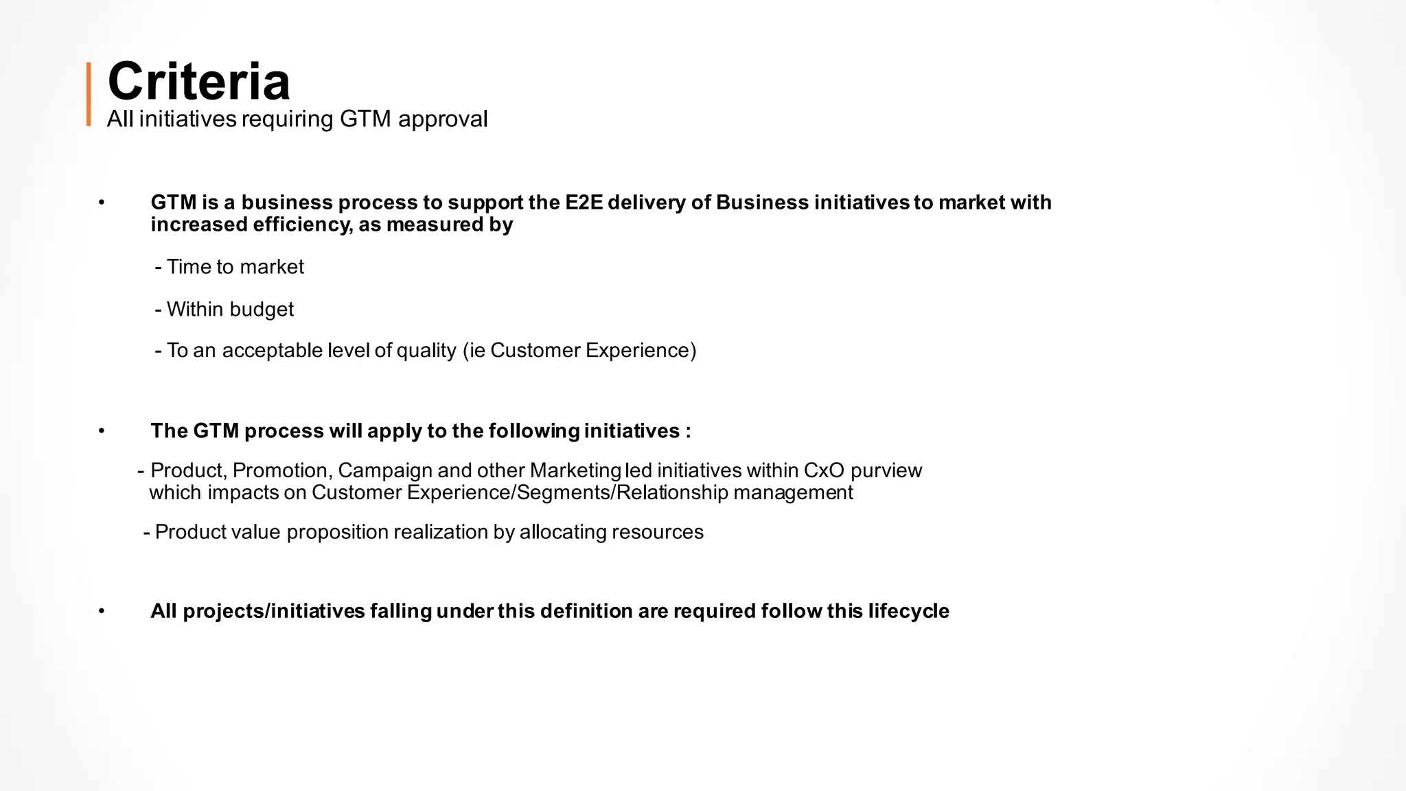 1) A multi-stage process from initiation to closure for initiatives requiring GTM approval, including concept, design, readiness for launch, and closure stages.