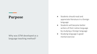 The Grammar Translation Method was developed in the 1500s to teach Latin and Greek. It focuses on reading, writing, and translating between languages over speaking and listening. In a Grammar Translation classroom, instruction is in the first language and learning involves extensive translation and grammar explanations. Students translate classical literature and are evaluated on accurate translations, with the goal of reading literature in the target language and having grammar and vocabulary accuracy rather than conversational ability.