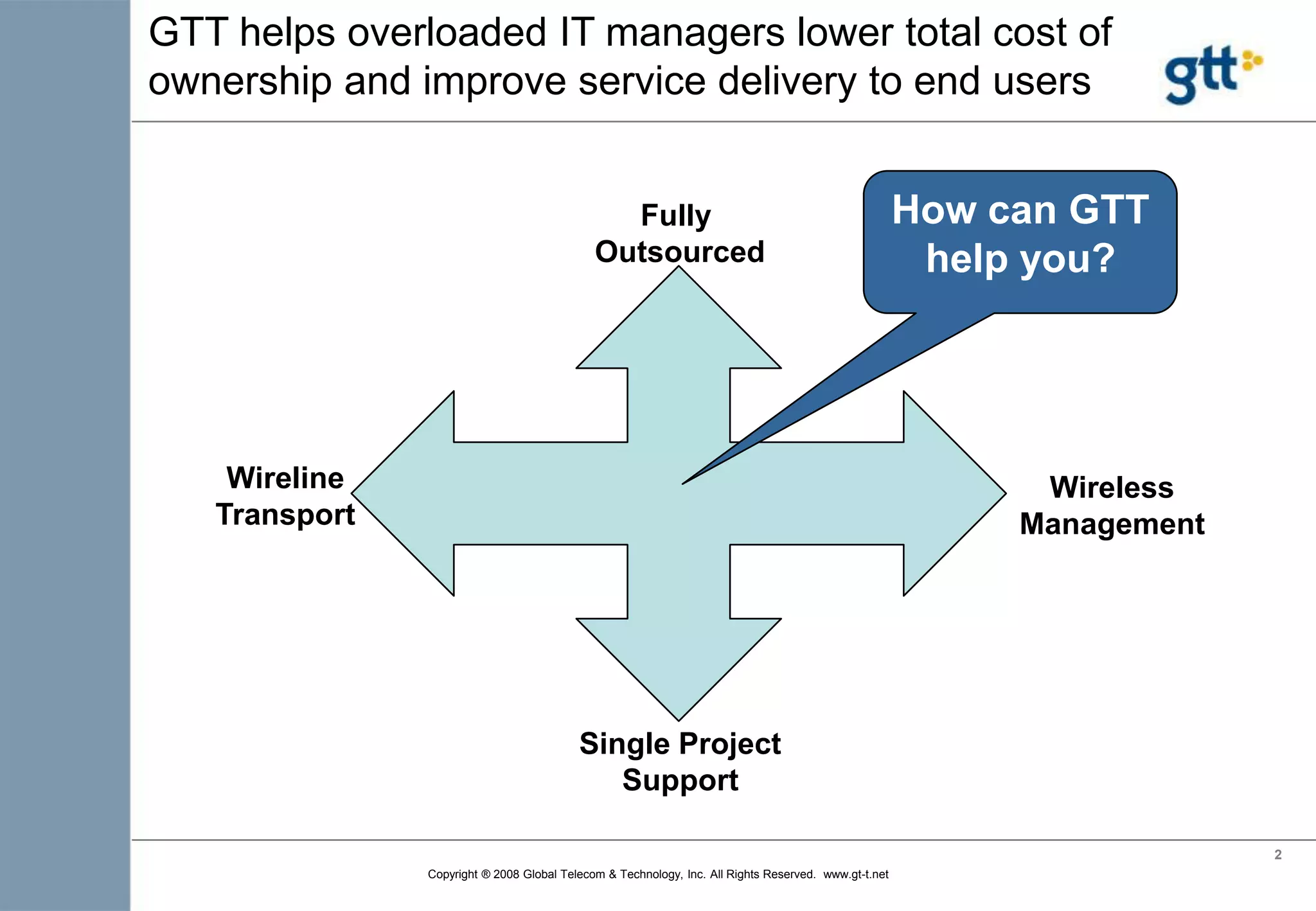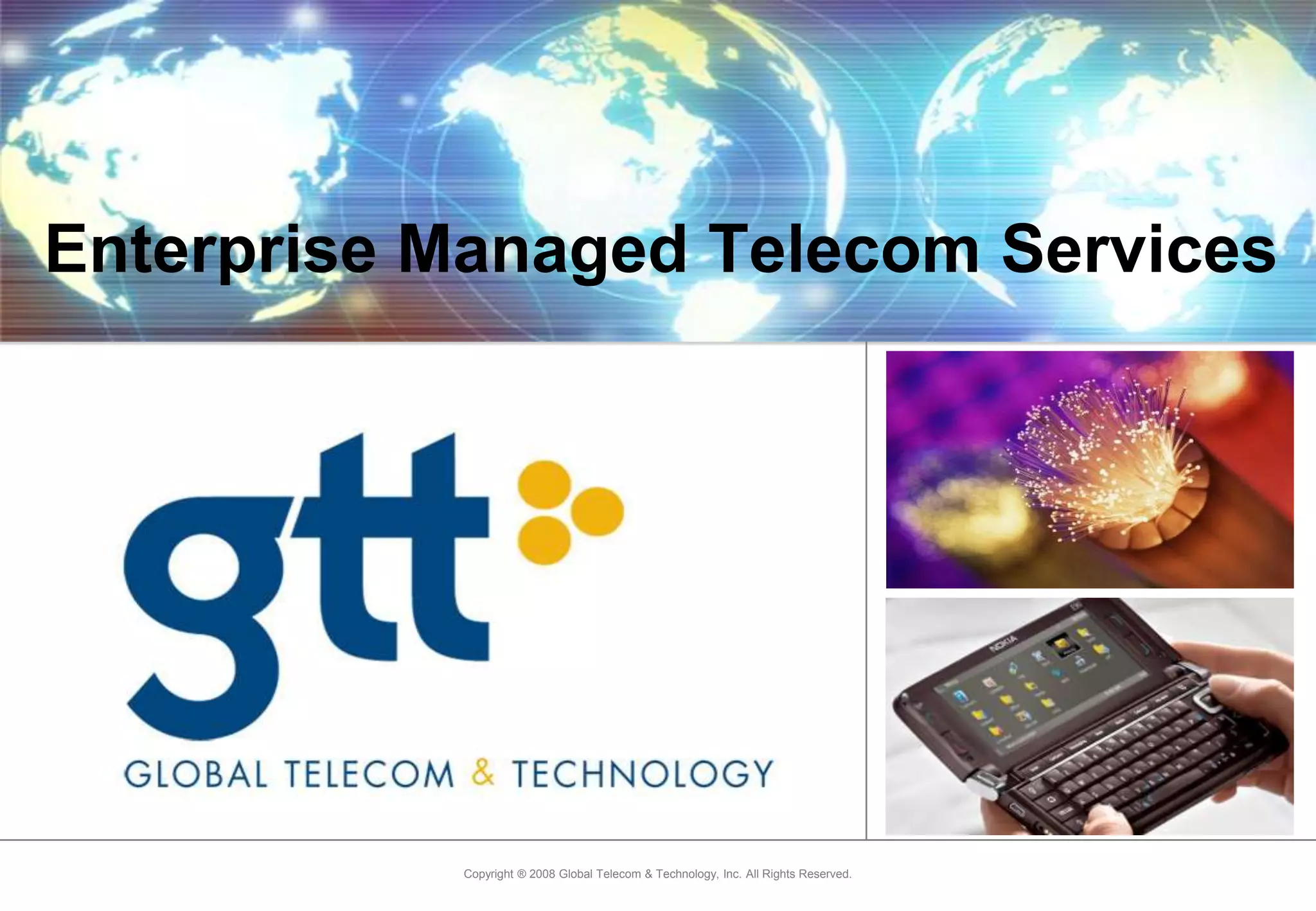 GTT helps companies lower telecom costs and improve service delivery. It provides fully outsourced wireline and wireless management services globally. GTT employees have decades of experience in telecom and can provide private line, Ethernet, dedicated internet, and VSAT services as well as network management and professional consulting services.