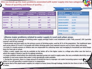 This presentation proposes solutions to improve access to clean drinking water and sanitation in India. It is presented by 5 students from Shankersinh Vaghela Bapu Institute of Technology, Gandhinagar. The presentation discusses current issues regarding water supply and sanitation in both rural and urban areas of India. It then proposes concepts for solutions involving installing water treatment plants, bio-gas generators, and "toilet malls" to provide clean water and sanitation facilities while addressing sustainability and funding challenges. Metrics are provided to measure the impact of the proposed solutions.