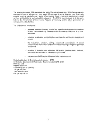 The document outlines the planning of water intake structures for irrigation and hydropower, produced by the German Appropriate Technology Exchange (GATE) as part of GTZ's efforts in developing countries. It emphasizes the importance of thorough planning, considering ecological aspects, hydrological data, and the methods for calculating necessary hydraulic operations to facilitate effective water usage. The guide aims to assist non-specialists in understanding the complexities involved in the construction of small-scale water intake structures, providing fundamental methodologies and considerations for successful implementation.
