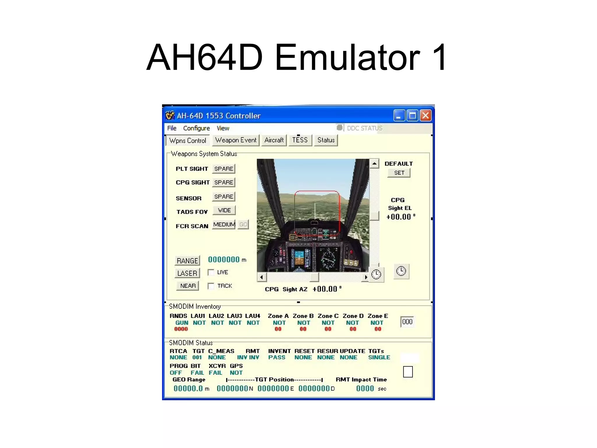 The document lists various emulators for military systems including the AH64D helicopter, MIL-STD 1553D standard, ASET-IV, ITAS, MLRS, and a virtual vehicle. These emulators were likely created using C++ and graphical user interfaces to simulate different components and allow for testing of military systems without use of actual hardware.