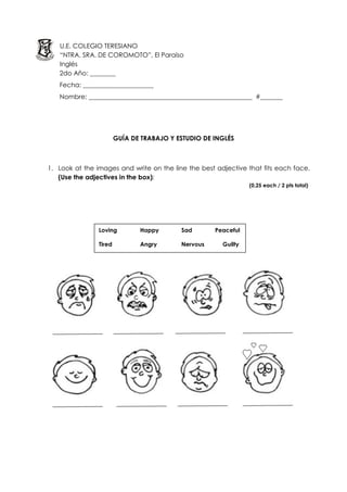 This document is a study guide for a 2nd year English class. It contains 4 sections for students to complete: 1) Match adjectives to facial expressions, 2) Change sentences to past tense, 3) Change sentences to negative and interrogative forms, 4) Complete a word search puzzle using vocabulary about days, months, and seasons. Students must provide their name, class number, and date at the top of the guide before completing the sections.