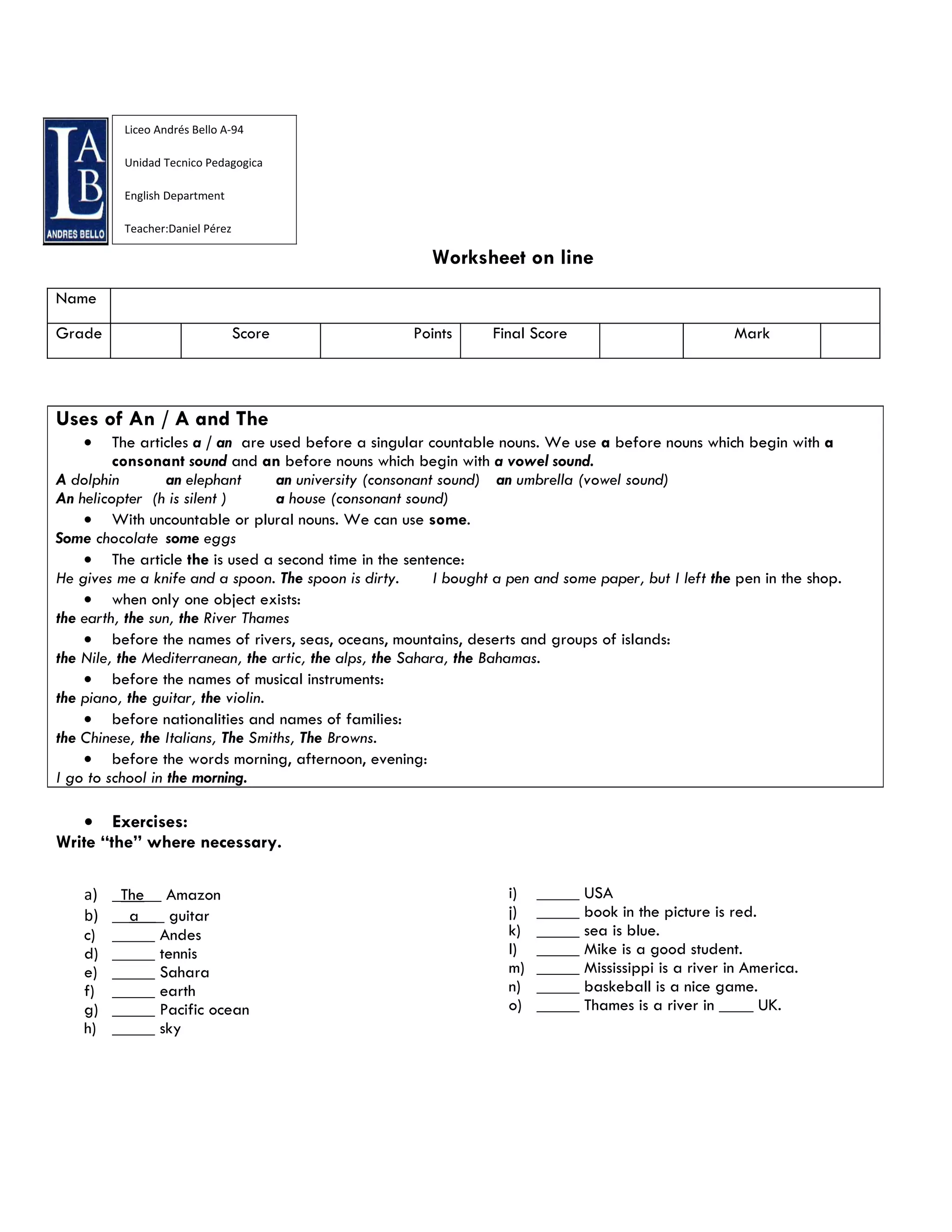 This document contains an English worksheet on grammar topics such as articles (a, an, the), verb tenses, word order, adverbs and questioning words. The worksheet provides exercises for students to practice these grammar concepts in sentences and short paragraphs with topics like family, school, activities and schedules. It includes spaces for students to write their answers and for teachers to provide scores and feedback.