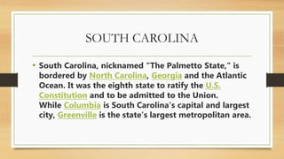 The document provides information about the educational system in South Carolina. It discusses that South Carolina has 751,660 students enrolled across 1,167 public schools within 79 districts. It also notes that South Carolina spends less on education as a percentage of its state budget than neighboring states and has lower scores than neighbors on standardized tests, with only 35% of 4th graders proficient in math. The document indicates that an area for improvement is student achievement, as South Carolina has room to boost test scores and the percentage of students performing at grade level.