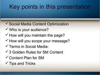This document outlines strategies for optimizing social media content, including understanding your audience, maintaining engagement, and creating effective content. It emphasizes the importance of being shareable, interactive, and relevant while providing guidelines on content types and maintenance. Key points include establishing an organized content plan, utilizing various social media tools, and continuously adapting to audience preferences.