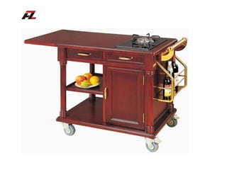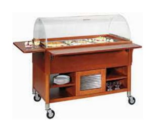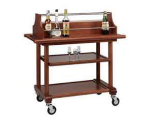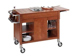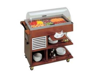 2. Trolleys are used for hors d'oeuvres, salads, food preparation/flambeing, cheeses, and liqueurs. Equipment includes flare lamps, gas stoves, chafing dishes, and carving boards.