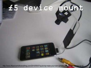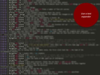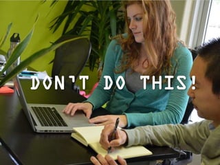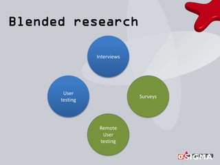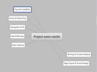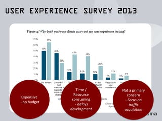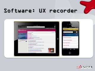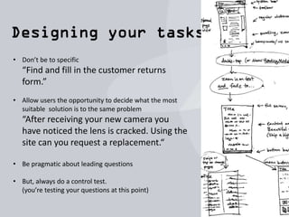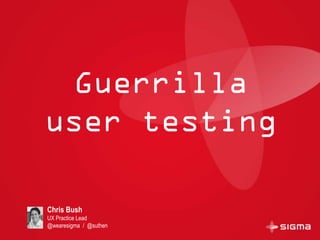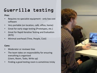 The document discusses guerrilla testing in UX design, outlining its benefits and drawbacks, such as low-cost and informal environments but potential bias and organization challenges. It emphasizes the importance of iteration and preparation, suggesting testing with 5-10 users across two rounds and using reflective questions during sessions. Additionally, it recommends coding notes for efficient analysis and considers the use of labs for final validation.