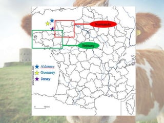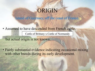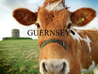 The Guernsey cow originated on the island of Guernsey off the coast of France. It has since spread to countries like the UK, US, Canada, South Africa, Australia and New Zealand. Guernseys are known for producing golden colored milk high in vitamins and protein. They yield an average of 6,500 liters of milk per lactation containing around 4.8% fat on average. Guernseys are well-suited for dairy as they are docile, efficient converters of feed, and have good temperaments for handling. Their milk makes quality butter, cheese and ice cream products.